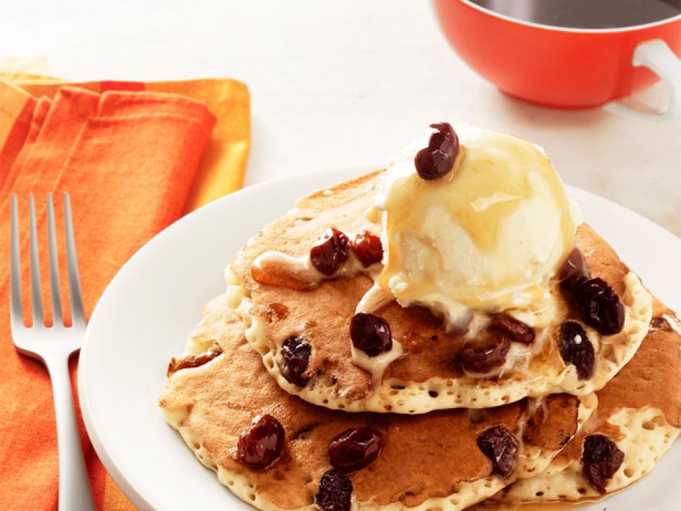 Whisk 1 1/2 cups flour, 3 tablespoons sugar, 1 teaspoon baking powder and 1/2 teaspoon each baking soda and salt. Whisk 1 1/4 cups buttermilk, 1/2 stick melted butter, 2 eggs and a little vanilla, 1/4 cup plumped raisins, then whisk into the flour mixture until just combined. Ladle 1/4 cupfuls onto a hot buttered skillet and cook until bubbly. Flip and cook until golden on the bottom. Heat 1/4 cup syrup with 1 tablespoon rum and 1/4 cup raisins. Top the pancakes with ice cream and the rum syrup.